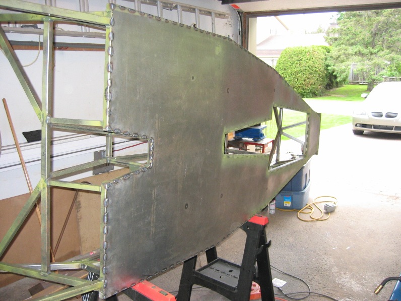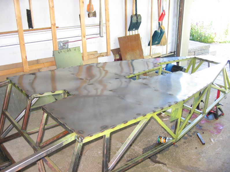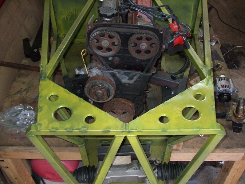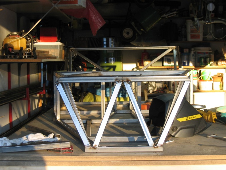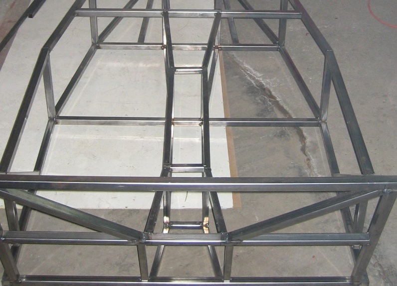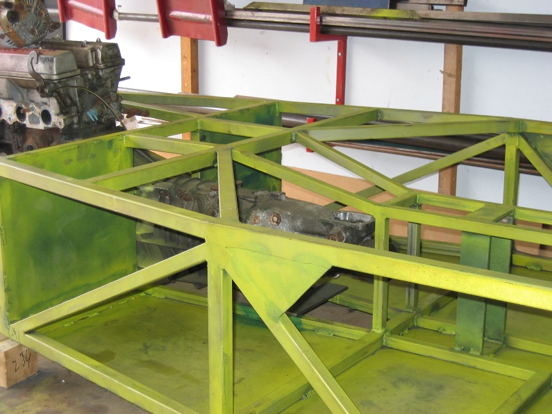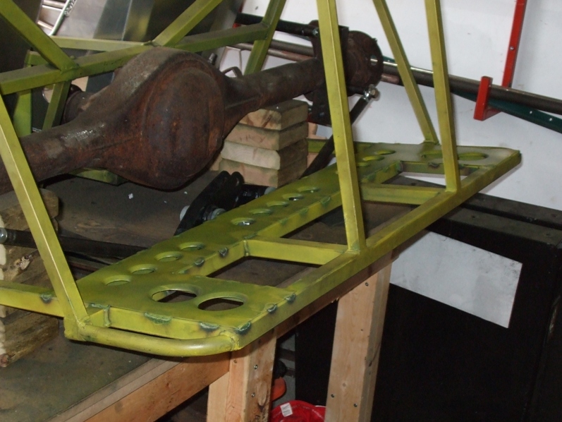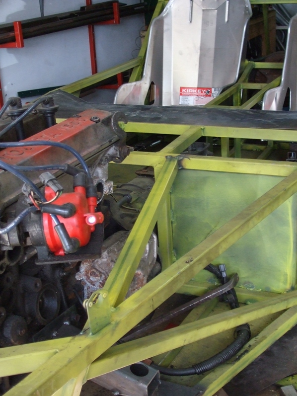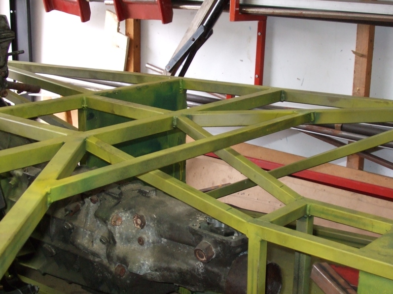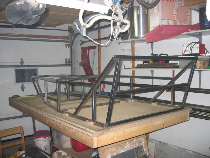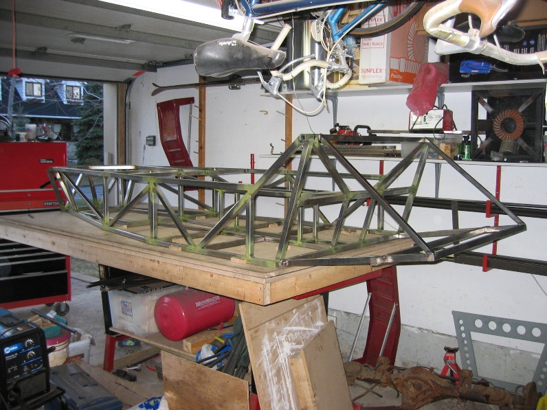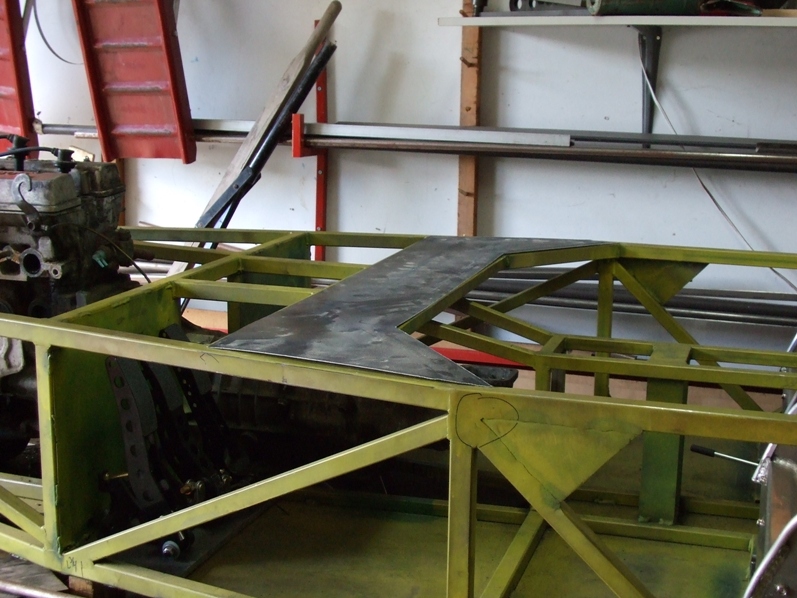 J'ai aussi incorporé un plancher qui fait la pleine longeur du châssis. J'ai continué de travailler sur mon châssis. Pour le renforcire j'ai ajouté un tube R additionel. Il n'y avait pas de problème d'interférence entre la futur colonne de direction ou le collecteur d'échapement. J'ai aussi a jouter des feuille de 22 gauge d'épaisseur à l'avant et à l'arriere dans la section pour le lien Mumford. Dans le